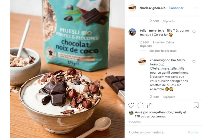 À travers son compte Instagram, Charles Vignon, qui vend des céréales bios, n'hésite pas à instaurer un dialogue agréable avec ses clients sous des publications à vocation a priori purement commerciales. Cette approche est idéale pour personnaliser la relation via un échange direct et, ainsi, proposer une expérience mémorable au client qui se sent unique.