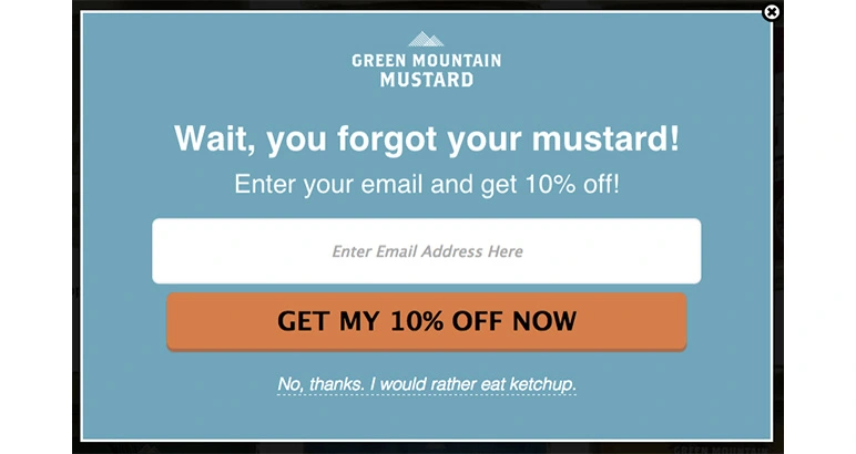 La situation où un client quitte votre site sans valider ses achats constitue également un excellent prétexte pour ce type de codes promotionnels. Intrigué voire remotivé, votre visiteur pourrait alors finalement décider de finaliser sa commande. C’est notamment le procédé choisi par Green Mountain Mustard, une entreprise d'agroalimentaire américaine :