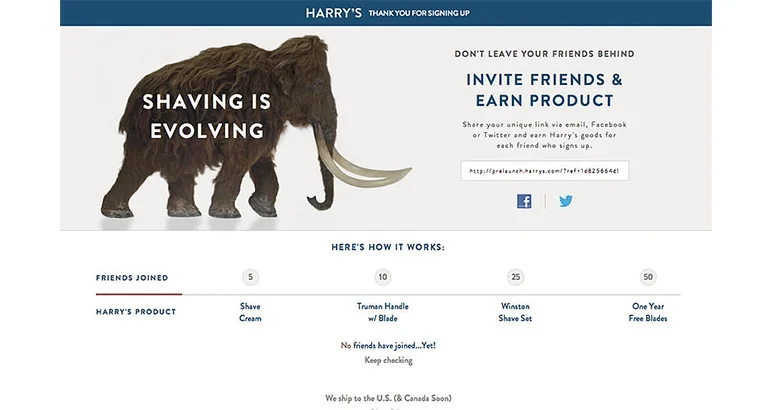 Une offre promotionnelle peut être un parfait moyen de soutenir le lancement d'un nouveau produit. C'est d'ailleurs la stratégie adoptée par Harry's. Il y a quelques années, l'entreprise de produits de rasage offrait un produit aux clients qui partageaient un lien de pré-lancement à travers les réseaux sociaux suite à la réception d’un email d’annonce. Harry's allait même plus loin en affichant un compteur pour permettre aux clients de vérifier leurs performances d'ambassadeur de marque.