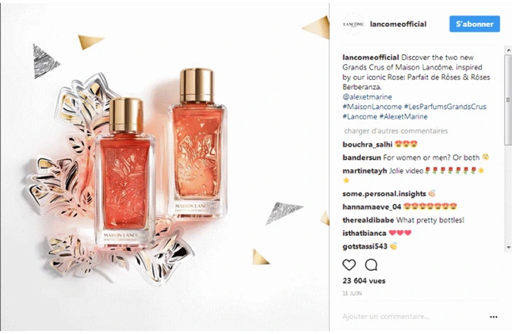 Lancôme est un exemple de marque, parmi d'autres, qui maîtrise parfaitement cet exercice. Simples mais efficaces, ses publications Instagram permettent à ses clients et aux curieux de découvrir ses produits. Par cette communication extrêmement travaillée, l'entreprise, détenue par l'Oréal, entend bien encourager sa cible à tester et acheter les dits produits.
