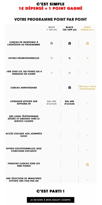 De plus, la carte Beauty Insider comprend plusieurs niveaux correspondant à différents avantages pour les clients. Plus le client dépense auprès de Sephora, plus les avantages sont nombreux. Ce cercle vertueux permet d’accroître la fidélité et la satisfaction client.
