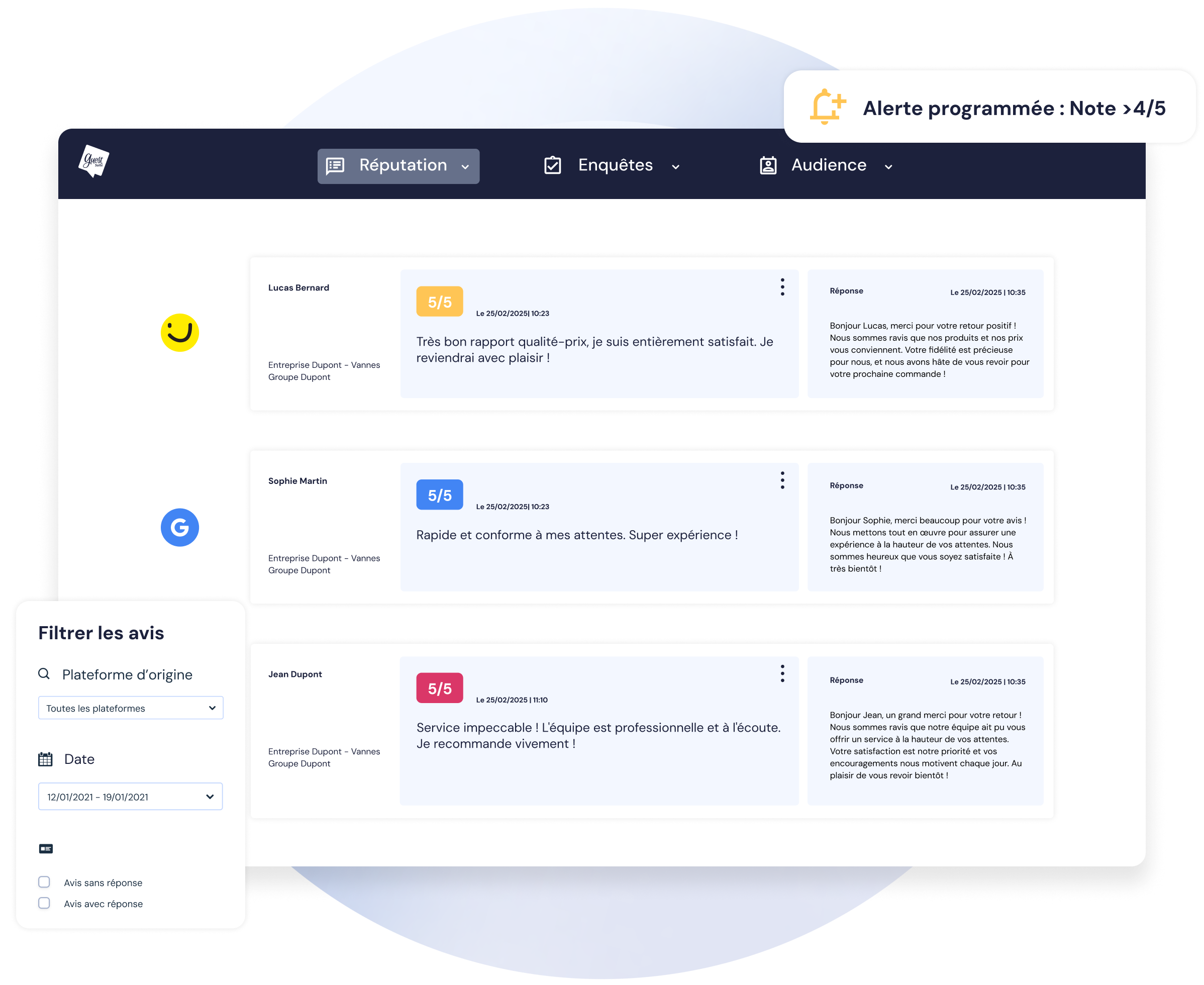 Avec Guest Suite, ne ratez plus un seul avis client : tous vos avis, spontanément déposés par les internautes sur Internet ou collectés via nos outils, sont centralisés sur une seule et même plateforme. Soyez alerté en temps réel, programmez vos notifications, filtrez, triez et analysez vos avis en un clin d'oeil grâce à des dashboards détaillés.